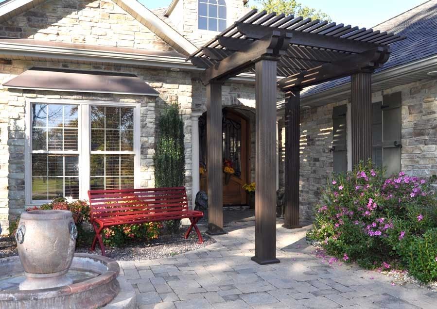 With the rich look of freshly painted cedar, our woodgrain aluminum pergola will provide you with years of maintenance-free enjoyment. Crafted of heavy-duty aluminum, our pergola systems offer the traditional look of wood, but unlike wood, require little or no maintenance and will not rot, warp, burn, splinter, require costly staining or harbor insects. Our aluminum pergolas are available in four beautiful woodgrain colors and carry a lifetime warranty.